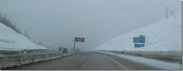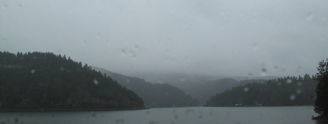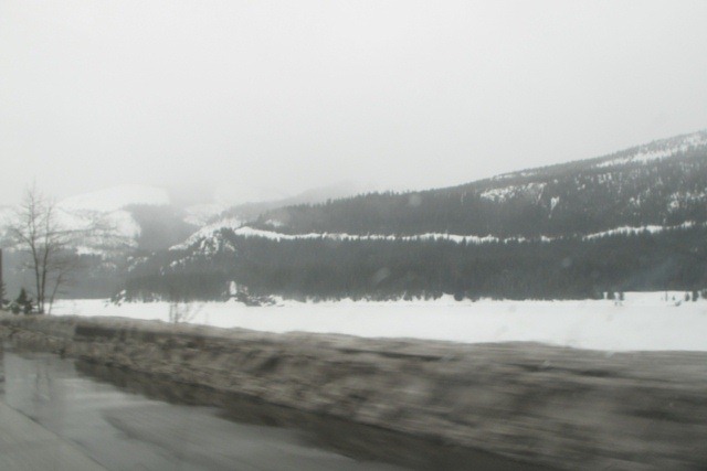 725am – We have crossed the Cascades and drive along Keechelus Lake, where the snow is fresh but the rain as well. Mountain Range #1 is taken. 3 more to go to cross the country.